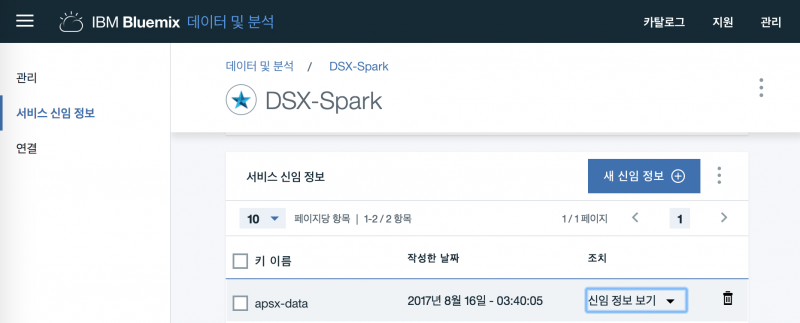 사이트에서 DSX가 사용하고 있는 spark의 credential 정보를 확인합니다. 확인한 Credential 정보에서 tenant_id, tenant_secret, instance_id를 확인하고 아래의 curl command를 작성합니다.