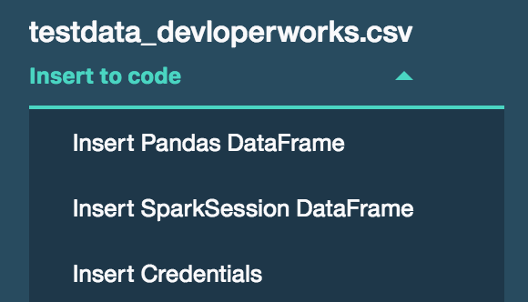 해당 위치에 파일을 직접 마우스로 올리거나 [browse] 버튼을 클릭합니다. 파일이 올라간 것이 확인되면 다음 단계로 이동합니다. (2) 업로드한 파일을 Notebook에서 불러오기 업로드한 파일에 [Insert to code] 버튼을 누르면 csv파일인 경우 아래와 같은 메뉴가 나옵니다. 여기에서 [SparkSession Dataframe]을 선택합니다.