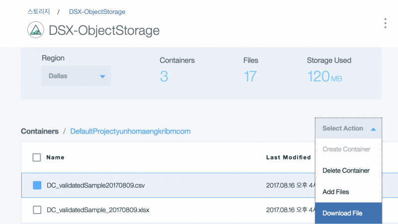(5) Object Storage만 사용한 경우 Object Storage만 사용하는 경우, 아래와 같이 IBM Cloud Console에서 간편하게 [Select Action] - [File Download]로 원하는 파일을 사용자 PC로 다운로드 할 수 있습니다.